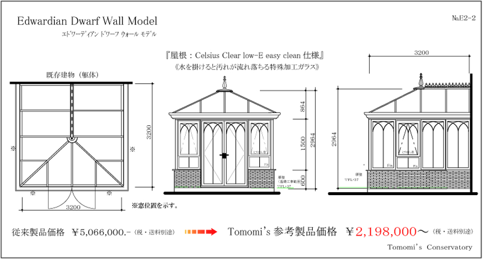| 屋根・壁仕様 | ・壁:外側:クリア強化ガラス4mm+20mm空気層+内側:クリア強化ガラス4mm ______総厚28mm ・屋根:Celsius Clear low-E easy clean |