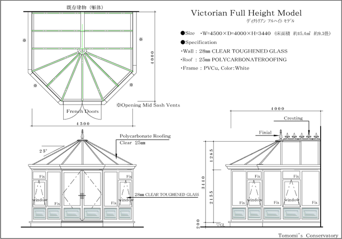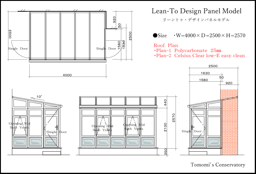 | 屋根・壁仕様 | ・壁:外側:クリア強化ガラス4mm+20mm空気層+内側:クリア強化ガラス4mm ______総厚28mm ・屋根:複層ポリカーボネイト 25mm または ・屋根:Celsius Clear low-E easy clean(お掃除のいらないガラス) |