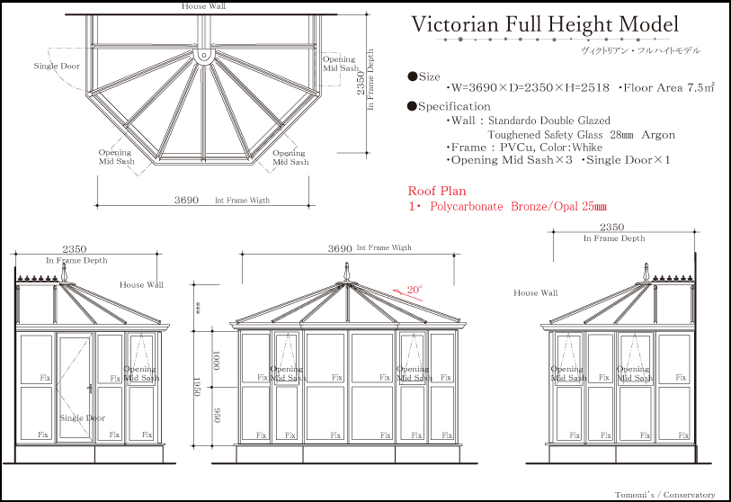 | 屋根・壁仕様 | ・壁:外側:クリア強化ガラス4mm+20mm空気層+内側:クリア強化ガラス4mm ______総厚28mm ・屋根:複層ポリカーボネイト 25mm |