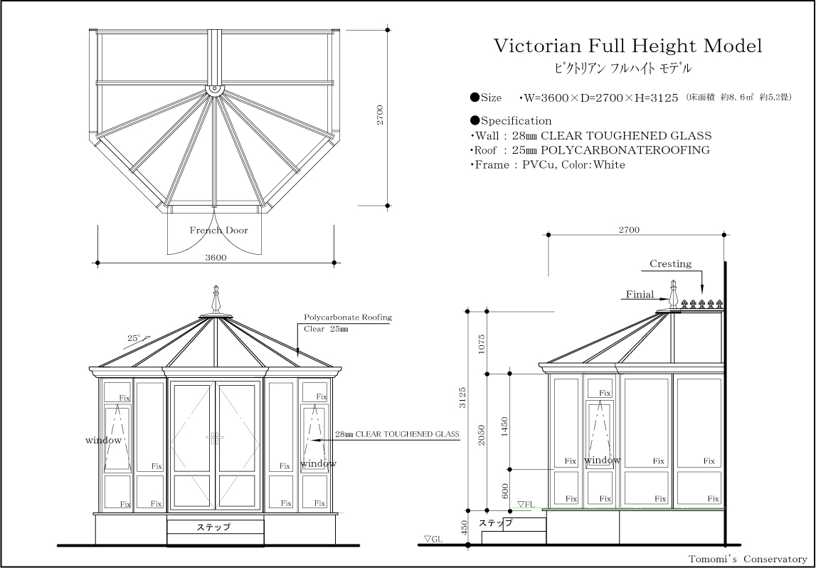 | 製品仕様 | ・屋根勾配25° ・両開きフレンチドア×1セット ・開閉すべり出し窓×4セット ・ドア、窓ハンドルカラー:ホワイト ・フィニアル クレスティング |