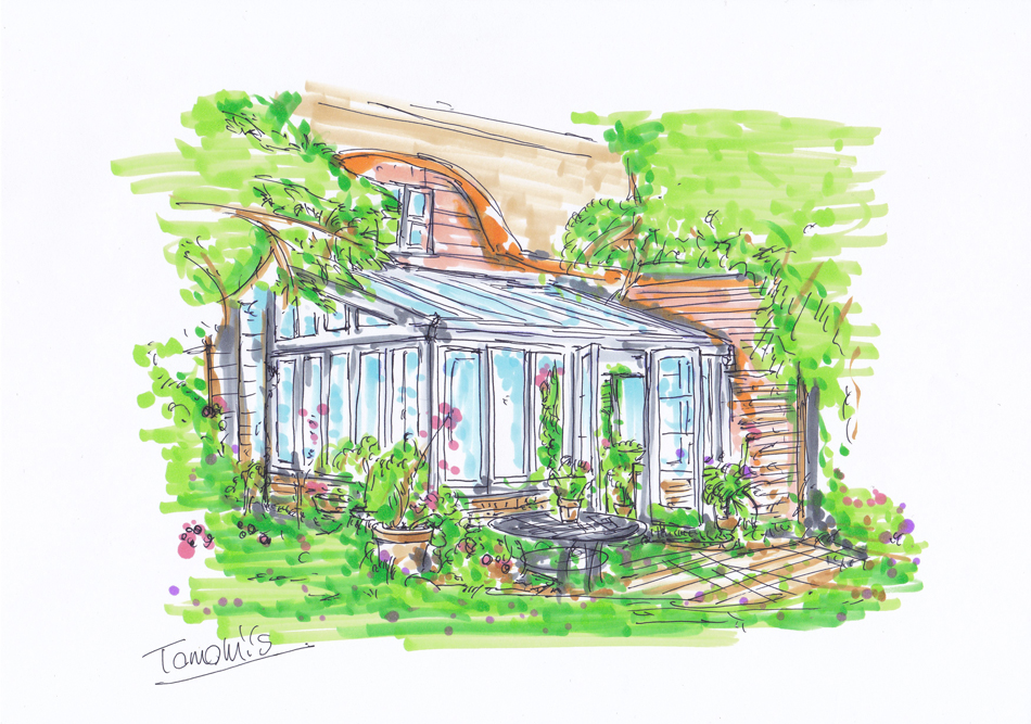 海外のコンサバトリー資料を参考にしながらコンサバトリーのスケッチを描きました。