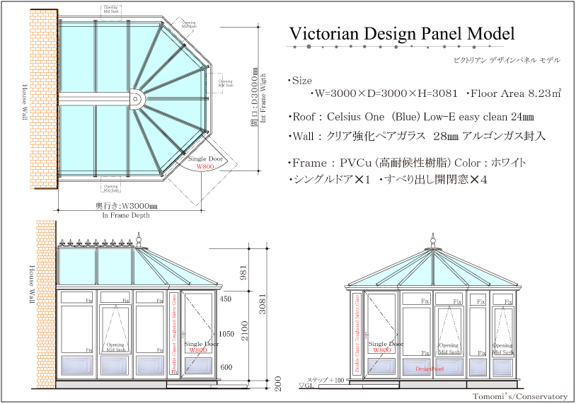 | Tomomi’s 参考本体価格 | ¥1,620,000-(税別) 屋根:ポリカーボネイト ¥1,800,000-(税別) 屋根:お掃除のいらない多機能ガラス |