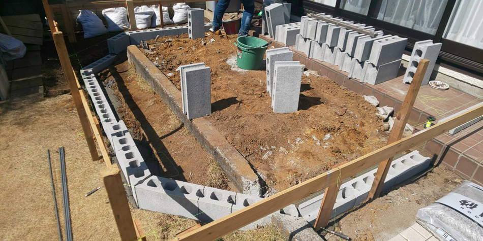基礎は重量ブロックを積んで造っていきます☆