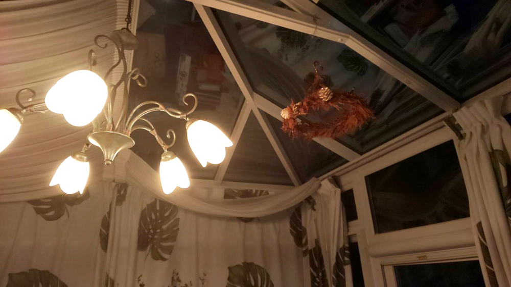 自宅のコンサバトリー内で台風の様子をうかがっています。