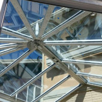 コンサバトリーのフレームが組みあがったら 屋根にガラスを架けていきます(*’ω’*)♪ うっすらと青く見えるのは表面がブルーに加工された多機能ガラスの特徴です! ガラスは1枚ずつ順番に合わせながら …