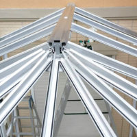 前回に続きコンサバトリーの施工をしてまいります☆ こちらのパートでは屋根フレームを架けるところまでご紹介いたします! ご覧いただいておりますのが屋根のフレームになります(*‘ω‘ *) アルミ材で複雑な形に成型された骨材 …
