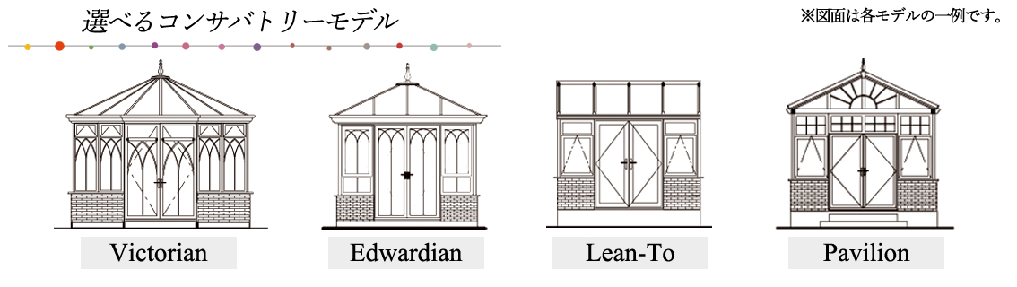 コンサバトリーにはそれぞれ特徴的で素敵なデザインを持つモデルがあります。