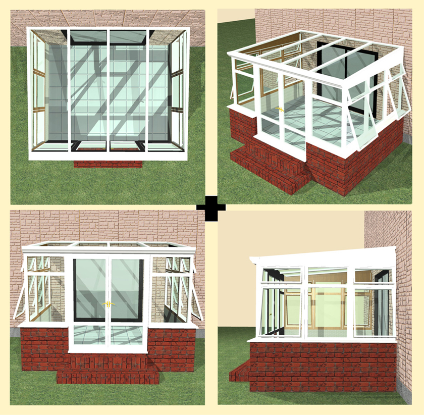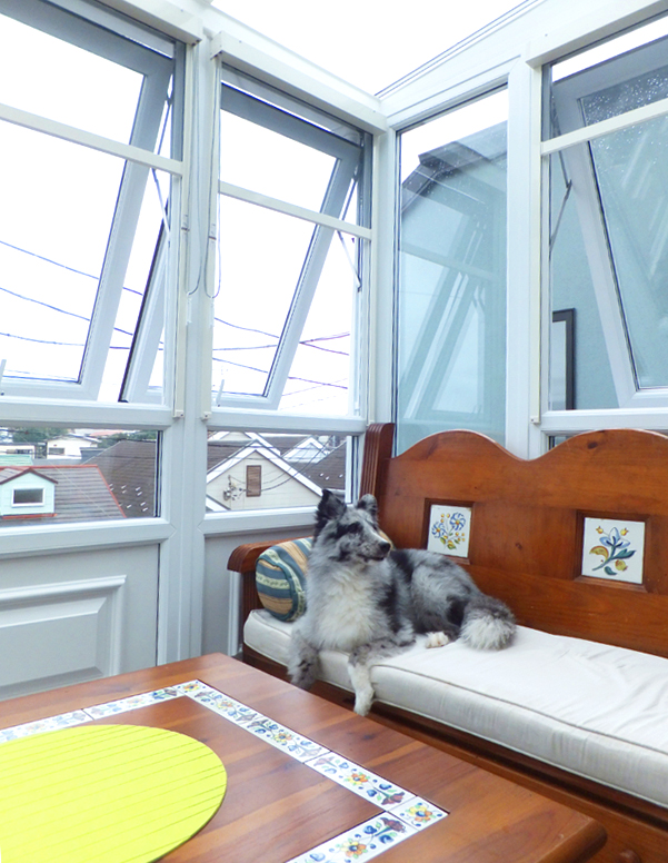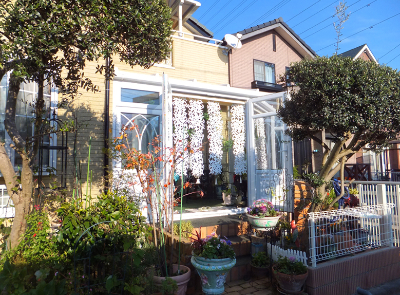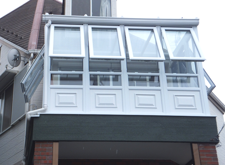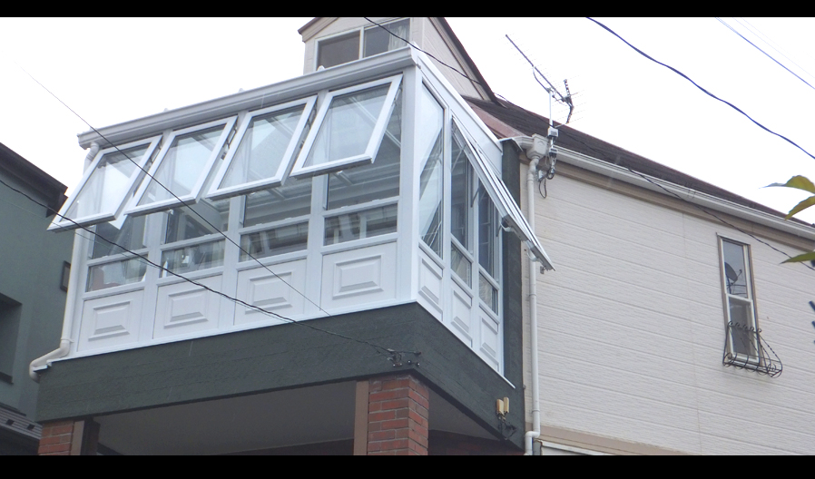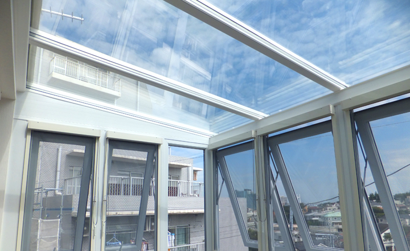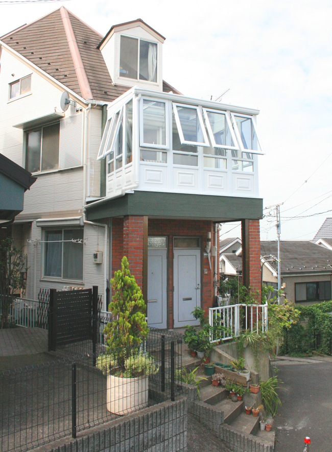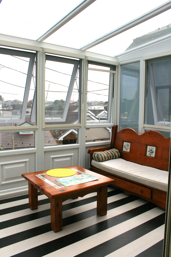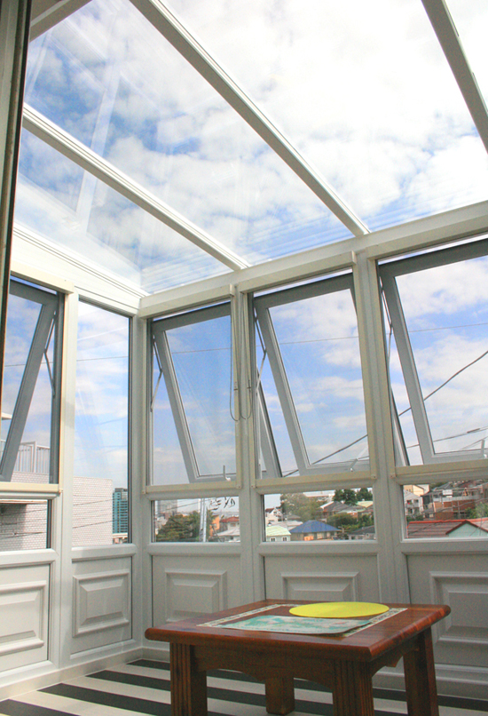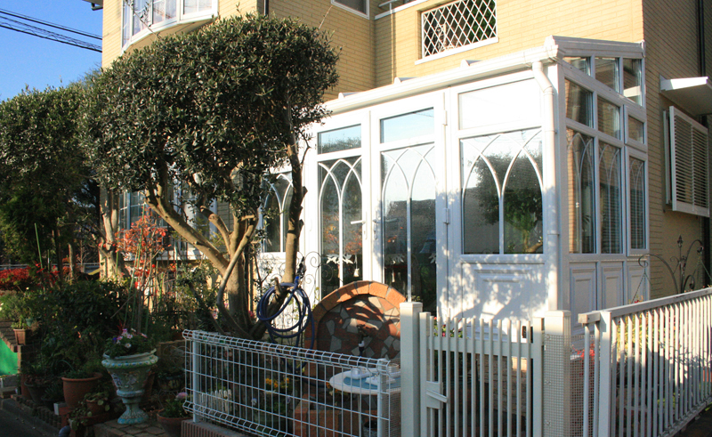 片流れの屋根が大きな特徴となっており、いわゆるサンルームとして日本でも定着している形です。