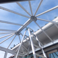 昨日の雨を全部吹き飛ばしてしまうくらいな気持ちで挑んだ コンサバトリー工事3日目となります(*´ω`) ついに屋根のフレームも架かり、コンサバトリー全体の姿がみえました! きちっと並んだ屋根フレームと、中心の棟部分が頂点 …