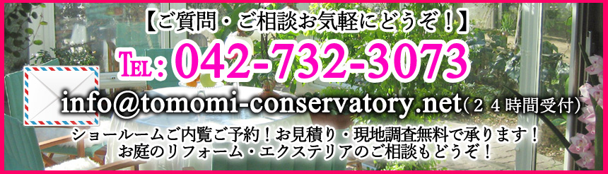 日本国内唯一のコンサバトリー専門店Tomomi's 無料お見積り、ご相談承ります! TEL 042-732-3073 9:00~18:00(年中無休)(メール24時間受付)