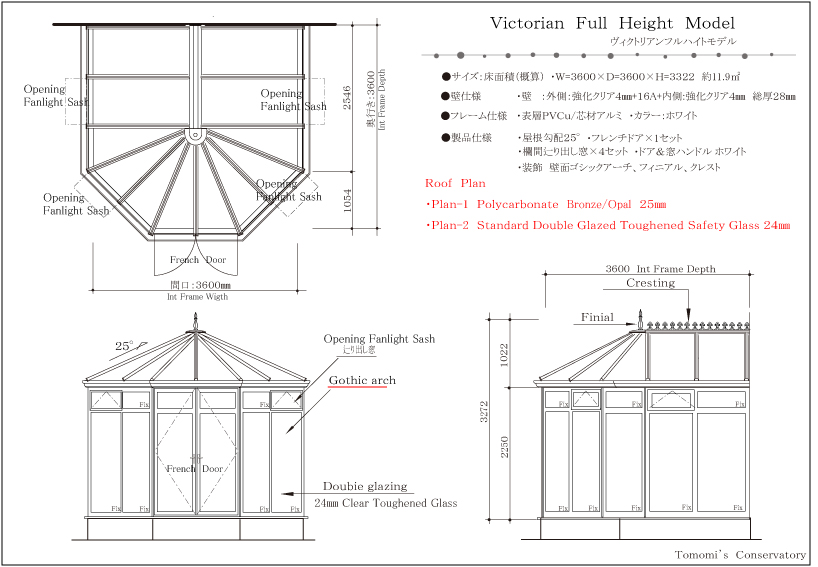 | Tomomi’s 参考価格 | ¥1,750,000-(税別) 屋根:複層ポリカーボネイト 仕様 ¥1,900,000-(税別) 屋根:クリア強化ペアガラス low-E 仕様 |